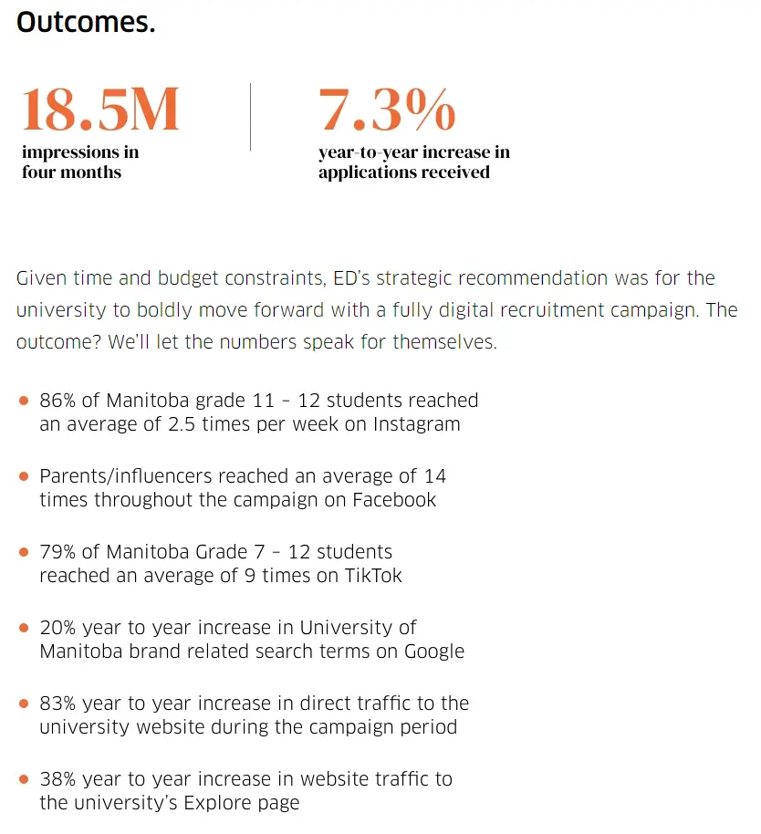 Agencies with content marketing expertise know how to craft narratives that resonate with prospective students. One prime example is ED Marketing and its collaboration with the University of Manitoba. ED Marketing's work with the University of Manitoba showcases their content marketing expertise in higher education. They executed a digital-only recruitment strategy, focusing on storytelling and emotion to connect with prospective students. By leveraging data and crafting over 230 diverse and engaging creative assets, they tailored their narratives to resonate with a Gen Z audience, effectively enhancing the university's appeal and addressing enrollment challenges.