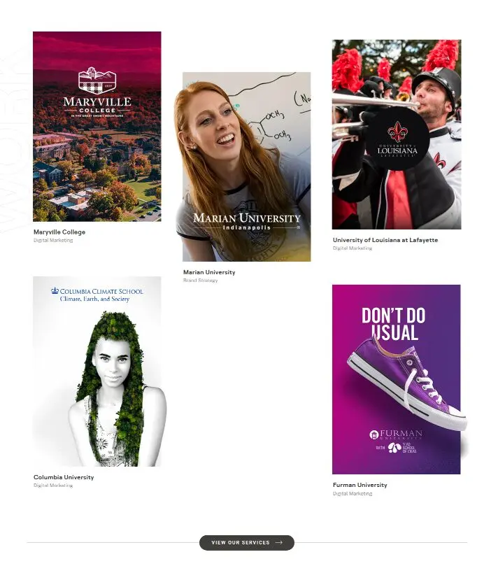 Take Up&Up as an example. Not only is this agency an expert in higher education marketing, but they have a portfolio to show for it. From launching marketing campaigns to increase enrollment numbers to developing strategies to enhance brand awareness for educational institutions, there's nothing the agency hasn't already done. Below is an image offering a glimpse of some of the past success stories.