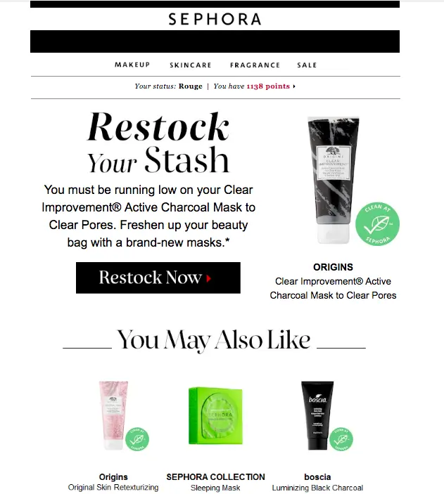 The triggers for the emails can be something like birthdays, purchases, or cart abandonment. Whenever these events get triggered, the corresponding emails are sent to your subscribers. For instance, Sephora sends out emails whenever the product purchased by their customers is about to be finished. They send an email to their customers with a discount offer for the same product to drive sales.