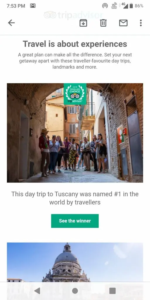 TripAdvisor optimizes their emails for mobiles so that it's easy for their subscribers to read them.