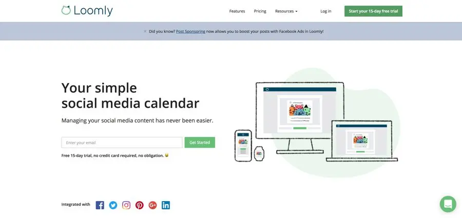 Loomly es una poderosa plataforma de gestión de redes sociales que posee una ordenada e intuitiva interfaz. Ofrece cuatro rangos de precios, desde una prueba gratuita de 15 días sin tarjeta de crédito requerida. Los precios oscilan desde un Plan Base de $20/mes para aquellos que tengan 10 o menos cuentas sociales, hasta el Plan Premium de $228/mes, el cual permite hasta 26 usuarios y 60 cuentas sociales.