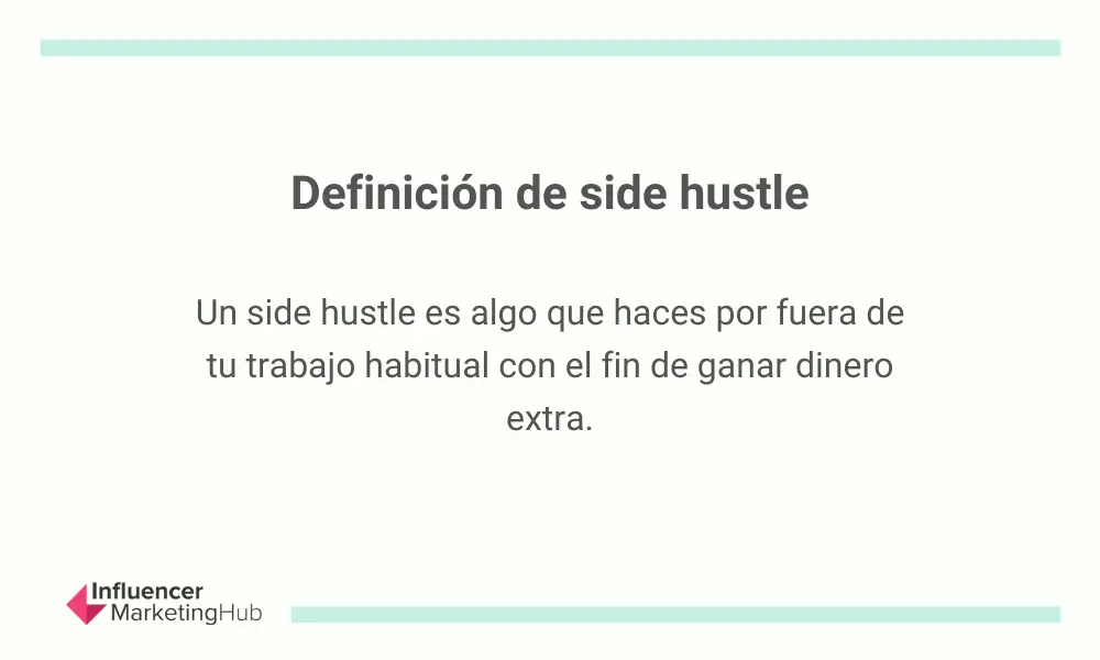 Un side hustle es algo que haces además de tu empleo normal. Mucha gente comienza un side hustle para ganar un poco de dinero extra. Algunos son capaces de desarrollar sus side hustles hasta convertirlos en carreras lucrativas, que finalmente reemplazan sus trabajos de tiempo completo. Si bien el término no es nuevo, en el pasado se solía usar para describir algo turbio o sospechoso. Sin embargo, actualmente es visto principalmente como una forma legítima de generar ingresos extra.