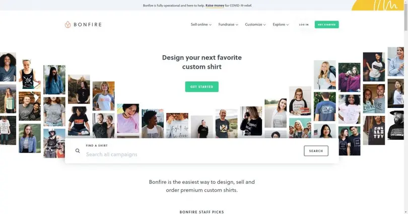 Bonfire es otra plataforma online gratuita que cualquiera puede usar para diseñar, vender o comprar productos personalizados. Gestionan el procesamiento de pago, el cumplimiento de pedidos y el servicio al cliente, lo que te permite seguir enfocado en el importante trabajo de conectar con tus seguidores y construir una comunidad. Desde que comenzaron en 2012, Bonfire ha ayudado a miles de grupos, individuos y organizaciones sin fines de lucro a recaudar dinero mediante la venta de ropa, bolsos, gorros y tazas, entre otros. Bonfire es el elegido de muchos influencers de YouTube populares como Abby y Anna, Jerry D’Erasmo y Marc Rebillet, entre otros.