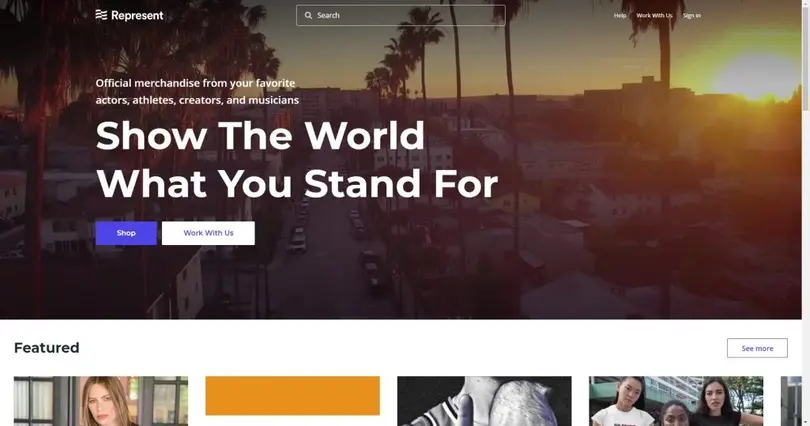 Represent es una empresa de merchandising sin problemas y sin riesgos que puedes utilizar sin importar lo que estés representando. Tal como en Spreadshop, tus ganancias están determinadas en cuánto vendes — no hay gastos o costos por adelantado. Represent incluye analítica por lo que puedes obtener un análisis profundo de los hábitos de compra de tu audiencia. Esto te ayudará a mejorar tus campañas y lo que ofreces, aumentando el ROI y las ganancias. Si quieres dirigir el tráfico a tu propio sitio web en vez de a tu página de campaña en Represent, ellos te brindan un código de incrustación para que puedas insertar un botón de Comprar Ahora o un widget de campaña en tu propio blog o sitio web. Represent se encarga del cumplimiento de pedidos y el servicio al cliente, y te permiten ofrecer promociones para impulsar tu estrategia de marketing cuando lo necesites. Trabajar con Represent es un proceso de cinco pasos: ellos diseñan tus productos, configuran tu tienda online, los fans compran tus productos, Represent los imprime y envía, y tú obtienes un pago. Trabajan con figuras de gran renombre como Leonardo DiCaprio, Camila Cabello y PewDiePie, entre otros.