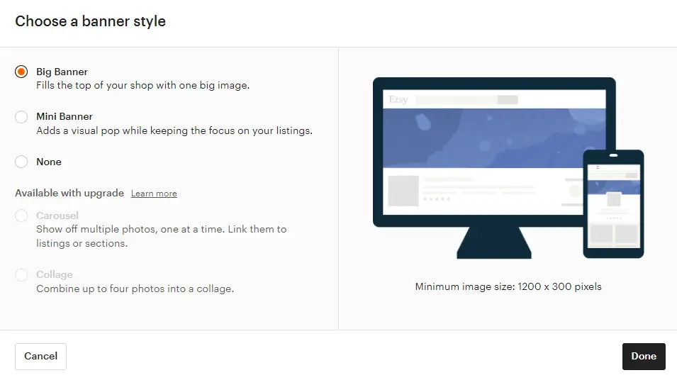 The Etsy big banner or cover photo allows for bigger image sizes and is a good choice if you have a bigger file size with high-resolution photos of your products. The minimum size for the big banner is 1200 x 300 px, and the recommended size is 3360 x 840 px.