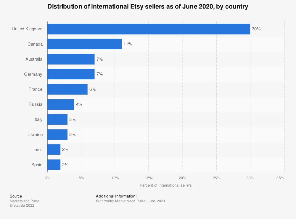 Etsy is open to buyers and sellers across 234 countries. However, certain restrictions may be in place regarding payment processes and shipping. 30% of international Etsy sellers come from the United Kingdom.