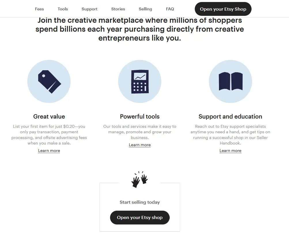 Etsy began as an online marketplace for creators. Through the years, it grew to become a global eCommerce platform that still retains its original ethos, which focuses on selling handmade and original, vintage, or craft supply products. Sellers are prohibited from marketing services, rentals, and metaphysical services or items.