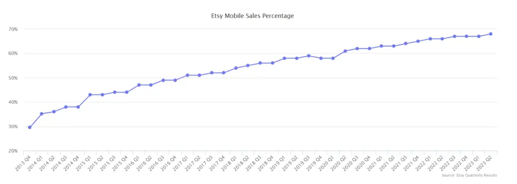 Etsy has been monitoring the proportion of sales initiated from mobile gadgets, including smartphones and tablets, since 2013. It's worth noting that sales started on mobile but finalized on desktops are not included in this metric. As of the first quarter of 2023, mobile sales stands at 67.0%, marking a 2% annual increase from the previous 66.0%.