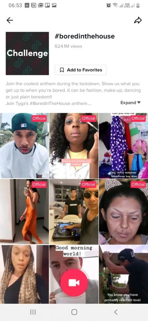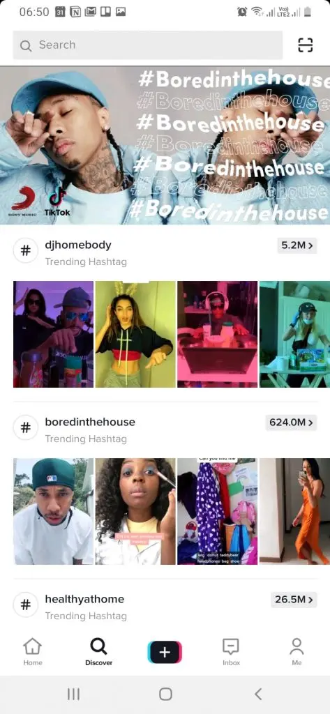 The Discovery section is where you'll find all top and trending challenges both locally and internationally. Challenges are identified by hashtag and will give you a preview of some of the most popular videos in each challenge, along with a count of how many have been submitted. Don't be surprised to see numbers in the millions and even billions. TikTok has a large audience that loves to record content.