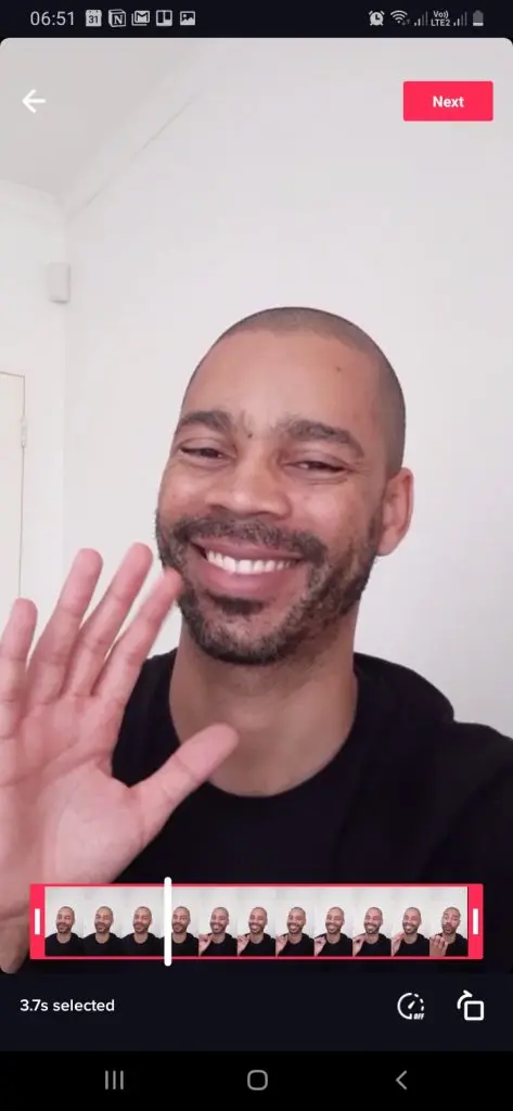 Tapping the Upload icon automatically opens your gallery of recorded videos. You're able to select your video of choice. Once selected, your video will begin to play and also open the trimming tool at the bottom of your screen. Using the trimming tool, you'll be able to cut and trim your video accordingly. You'll also be able to control the speed of your video and change its orientation, with the option of flipping it clockwise.