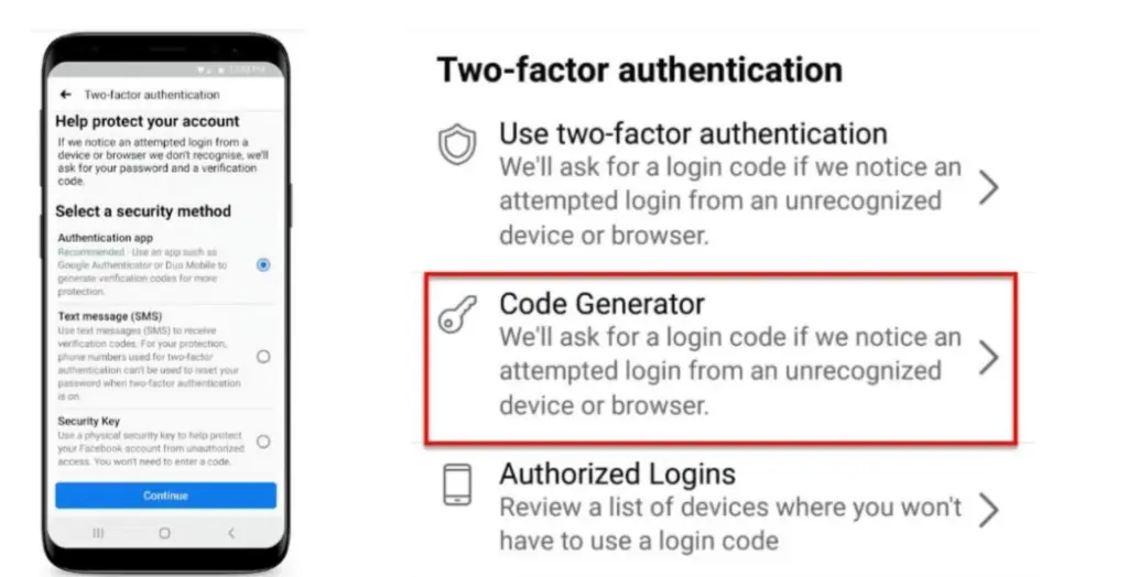 But users later complained about receiving unwanted notifications or spam messages on their phones after activating the (2FA). In 2018, Facebook said that a bug caused this problem and launched the code generator amid the call of security experts not to use the 2FA. The code generator is designed to provide an added layer of protection by asking you to type a six-digit code that will display on Facebook or your mobile device when you log in from a new or different device. This feature helps ensure that not just anybody can get into your personal or business account, steal valuable information, change your settings, or even lock you out of your own account.