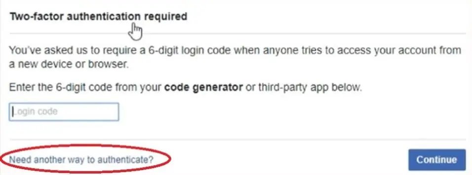 If you can't get a code from Facebook's Code Generator, click “Need another way to authenticate.”
