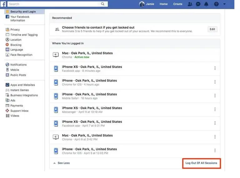 - You find other devices listed under "Where You're Logged In" in the Settings>Security and Login that don't belong to you or you don't recognize.