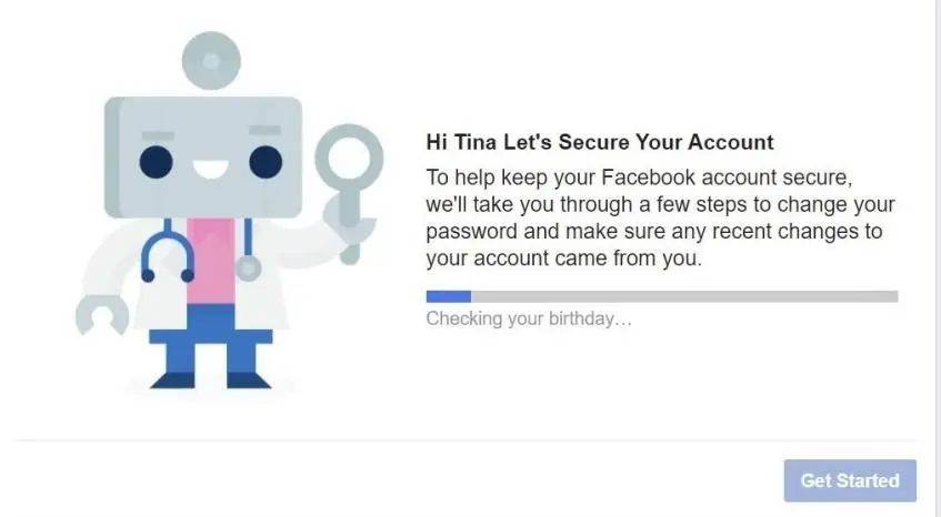 - Let Facebook run a security check through "Let's Secure Your Account." When this message or window appears, click "Get Started" and follow the instructions.