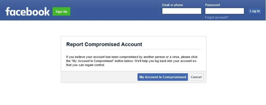 - You may report the incident to Facebook by going to https://www.facebook.com/hacked and clicking the button “My Account is Compromised.” You'll then have to provide information, including the phone number or email address you linked with your Facebook account, the last password you used, and why you think your account is compromised.