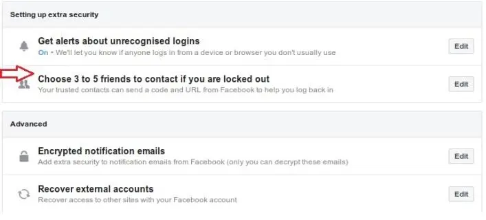Under "Setting Up Extra Security" in your Password and Security settings, tap "Choose 3 to 5 friends to contact if you get locked out." Facebook may ask you to confirm your password before it lets you select your contacts. Once you’ve confirmed your password, you’ll have to type the names of at least three of your contacts. When Facebook generates their profile pictures, click on their names and click Confirm.