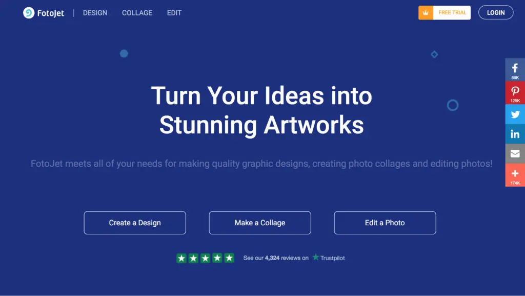 FotoJet is a free online collage maker & graphic designer that helps you turn your photos into amazing collages, photo cards, social media graphics, posters and then quickly share with family and friends via Facebook, Twitter, Pinterest or Tumblr, providing 600+ creative collage templates, 80+ classic collage layouts and 300+ professional designs. It works perfectly in any browser without the hassles of downloading and installing!