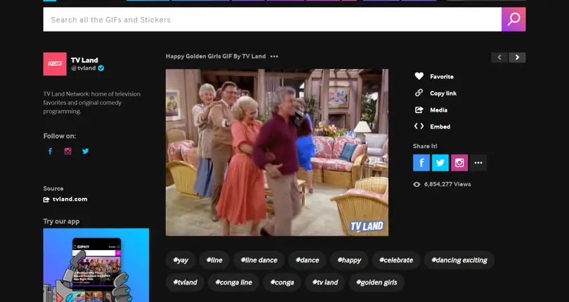 As you can see from the tags used, TVLand uses their own brand name in the tags along with other keywords that users might search to find a GIF like this: “yay,” “conga,” “happy,” and others.