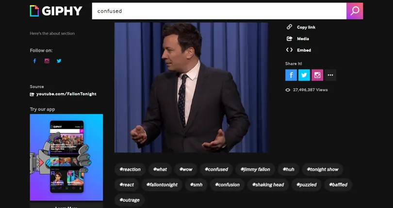 Let’s take a look at the tag “confused” on GIPHY. We’ll go ahead and just click the first GIF that shows up for that keyword:
