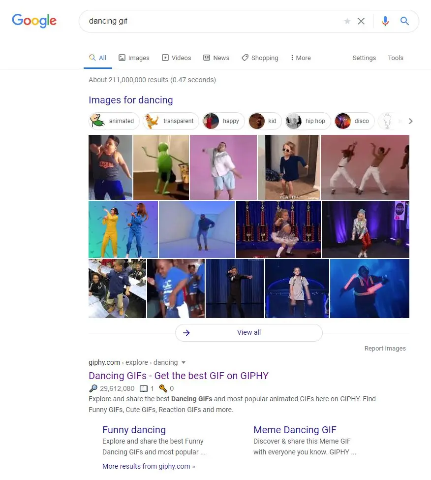 GIPHY search results pages are themselves indexed by Google. Here’s what comes up when you search for “dancing gif:”
