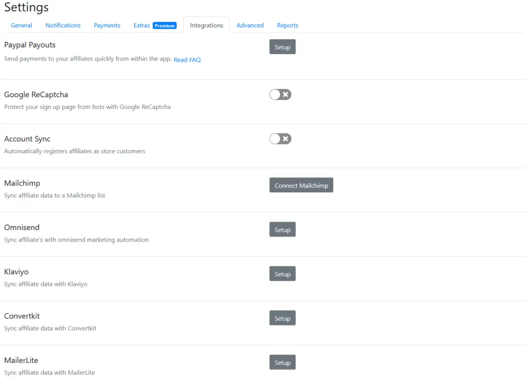 As a marketing tool, GoAffPro’s developers know where its value is and so integrates with a number of marketing platforms. Mailchimp, Klaviyo, Omnisend, Hubspot, ConvertKit, Mailer Lite, ActiveCampaign, and CampaignMonitor are all supported.