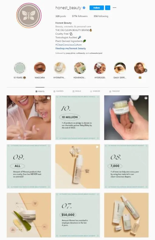 This not only helps you diversify your content but it allows you to maintain a clean and coherent page. And your audience can anticipate what to expect next because you’re following a consistent posting sequence. Here’s a beautiful example from Honest Beauty where they post product images alternatively with text posts containing facts and stats.