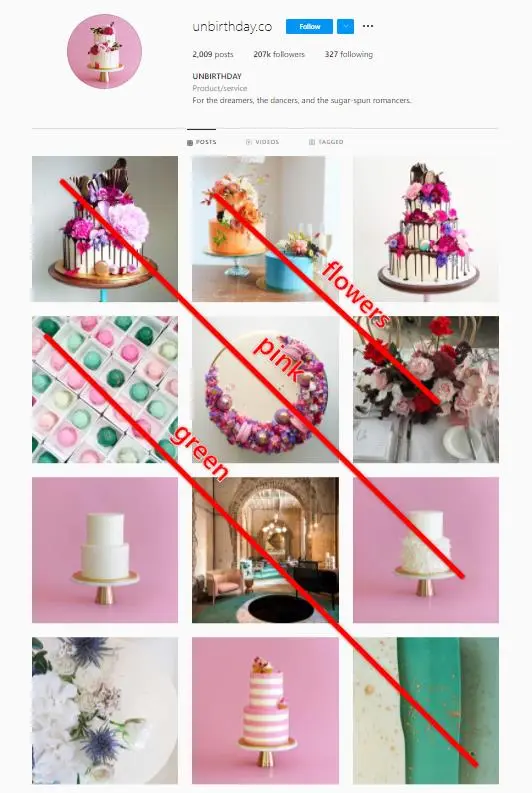 You could start out by taking some inspiration from your brand colors. Then decide on two or three shades that align with the colors that you want. Unless you plan on using the rainbow layout, avoid choosing too many colors as you could end up with an inconsistent feed that doesn’t really say much about your brand.