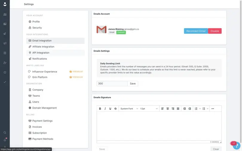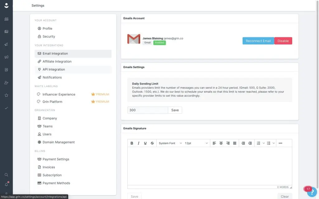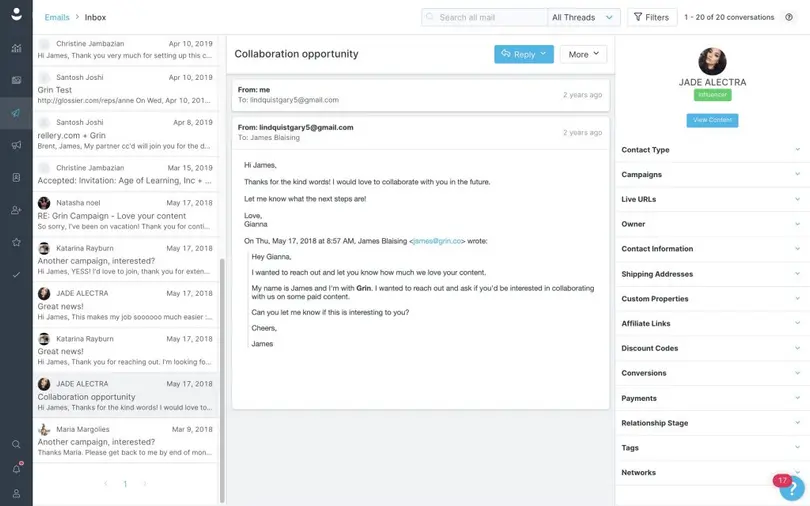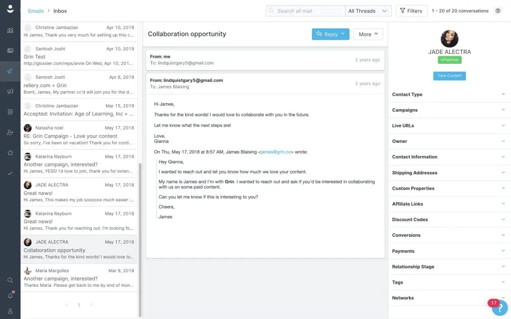 - Email systems like Gmail and Outlook integrate directly with Grin’s messaging system, so that every message you send from Grin comes from your mail domain, not some weird one-off address that’s separate from your actual email (while still keeping all Grin-related messages visible within the software, too)