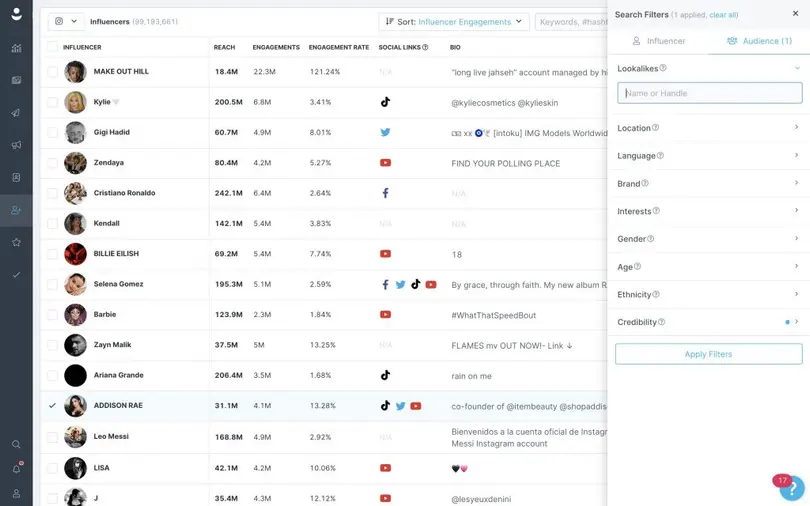 Grin gathers all the registered users from your eCommerce website and then gathers information about their social profiles to generate a list of potential influencers and their relevant statistics. It also offers a social listening feature to monitor brand mentions and hashtags as another way to help you identify possible influencers with whom you can work. Lastly, you can also use it to create a landing page for influencer applications as a type of recruitment tool.