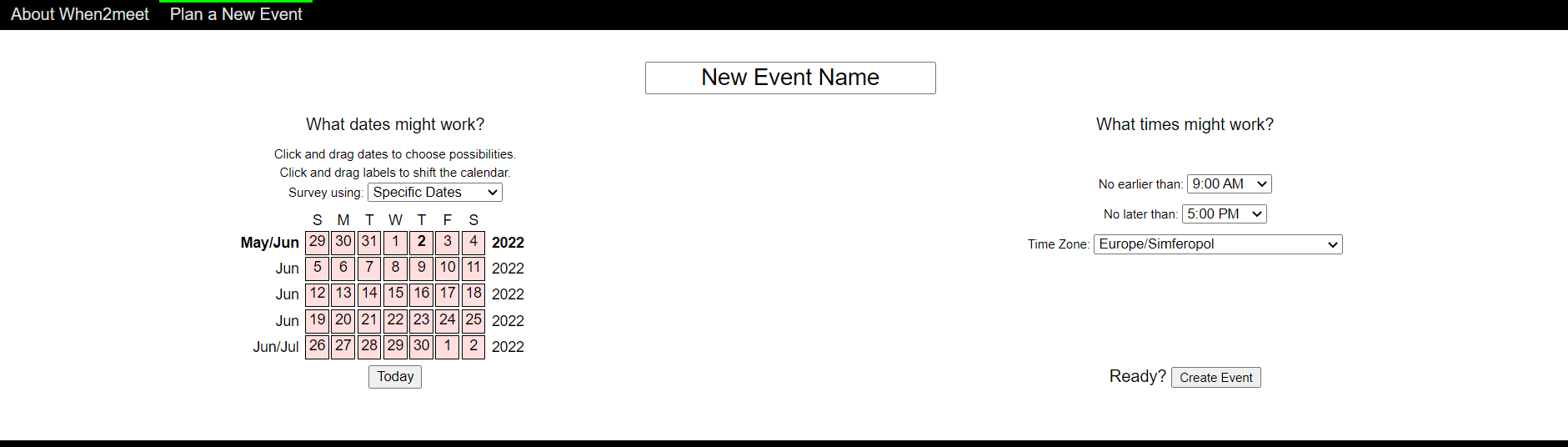 When2meet is very similar to WhenIsGood. It’s very basic (even more so than WhenIsGood). Also, its interface is not pretty (even less modern than WhenIsGood). Though, if you don’t want to pay anything and you don’t want to share any personal details like your email address, this is a possible solution. With When2meet you can invite people to your event by emailing them, sending them a Facebook message or simply directing them to the generated link.
