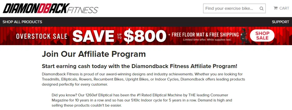 Joining its affiliate program is free and quite simple. Once you get access to the wide range of Diamondback Fitness banners and text links that you can post on your website, you’d have the opportunity to earn a 10% commission for every qualified purchase made by your audience.