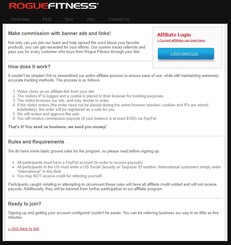 Joining the program is also free, and when you do, you’ll get the chance to earn 5% for every sale that’s made. Also, being an affiliate for Rogue Fitness requires you to have a PayPal account with at least $100 in your balance. It’s not the ideal situation, but the company makes up for it by giving you access to a wide range of marketing resources and creative collaterals.
