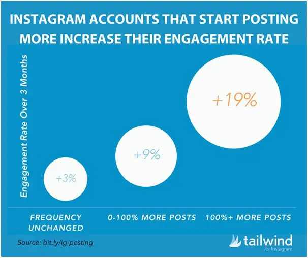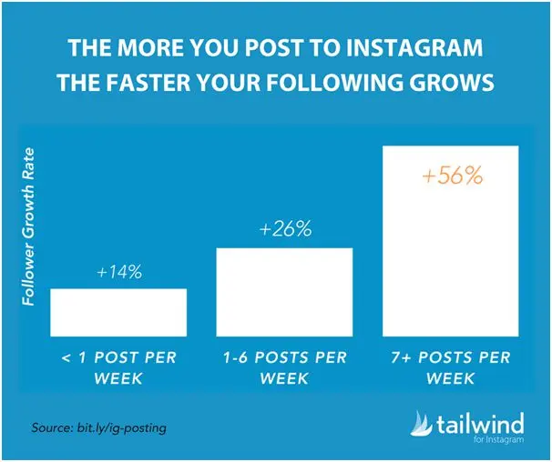 Tailwind conducted a thorough study of 100,000 Instagram posts for three months. Through this study, they discovered that the engagement rates for accounts that posted once in a week and accounts that posted seven times a week were significantly different. In fact, they also noticed that an increase in the rate of posting also boosted the engagement rate and follower growth rate.