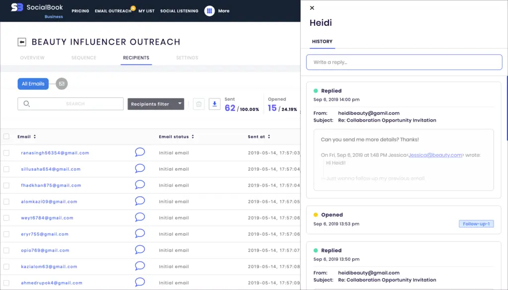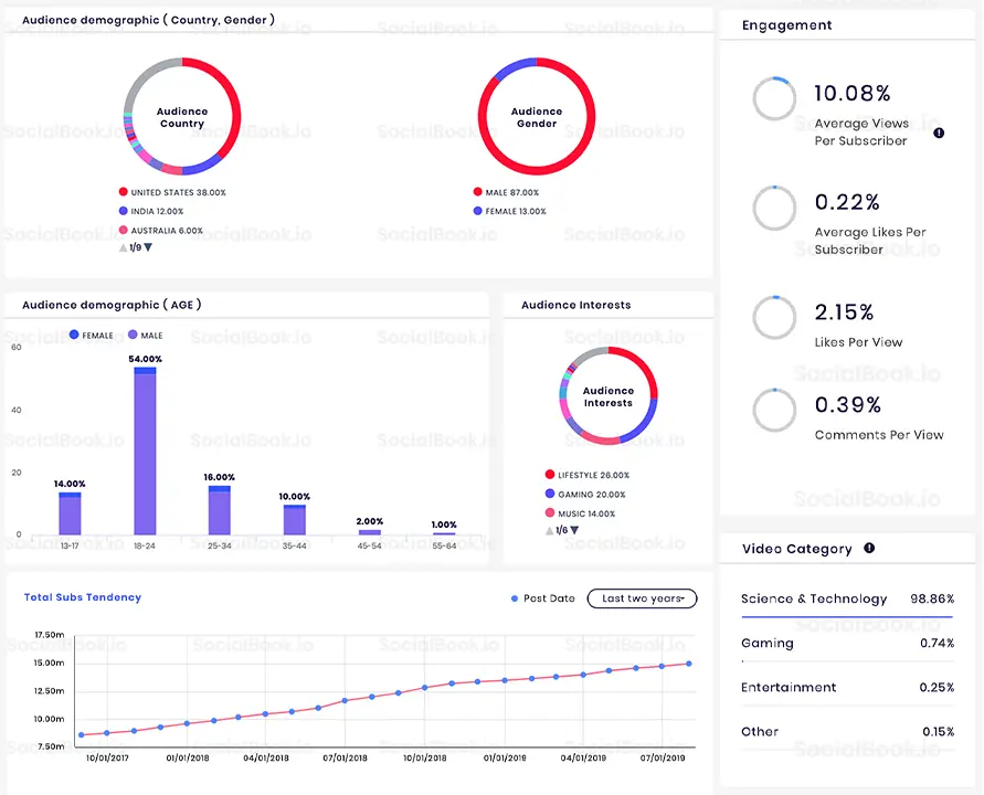 SocialBook provides comprehensive, detailed data about influencers on YouTube, Instagram, and Twitch. We might not be ideal for somebody intending to run a Twitter-only campaign. We have chosen to specialize in providing comprehensive data (on our selected social networks). We also place emphasis on easy communication, allowing brands to send emails directly to influencers. SocialBook also specialized in easy management and in-depth analytics/reporting.