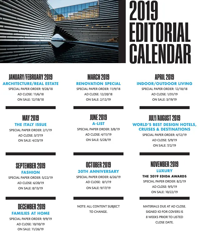 For inspiration, also have a look at a few magazines' editorial calendars. Most international magazines are really good at planning a whole year ahead. This doesn't mean they start working on December's content in January, but it allows journalists, advertisers and all stakeholders space to be creative months in advance.