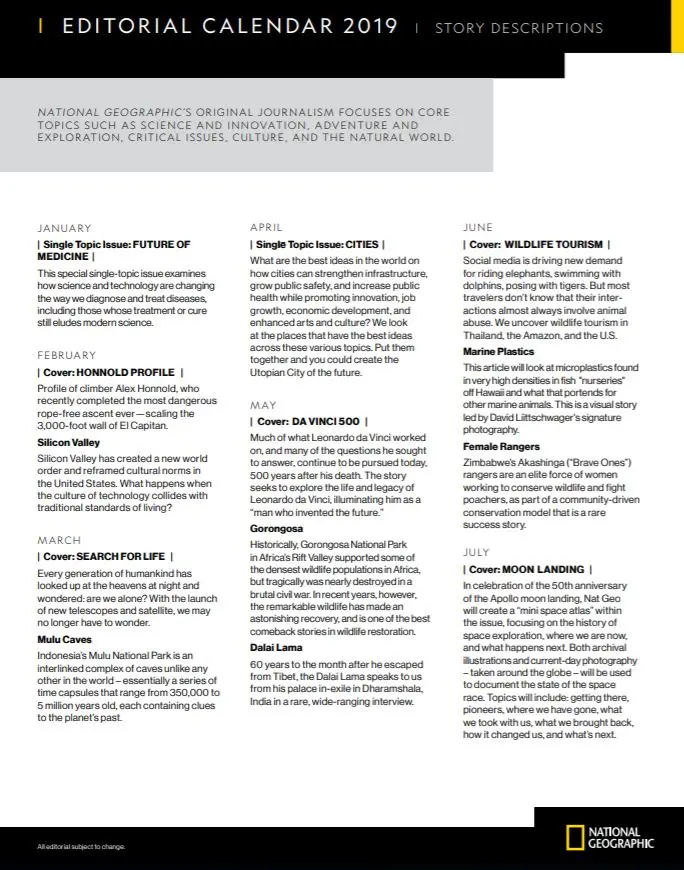 Travel magazine National Geographic's calendar is much more detailed and organized according to themes that gives a comprehensive overview of the content planned for the entire year – extremely useful for all team members to draw inspiration from for their own planning.