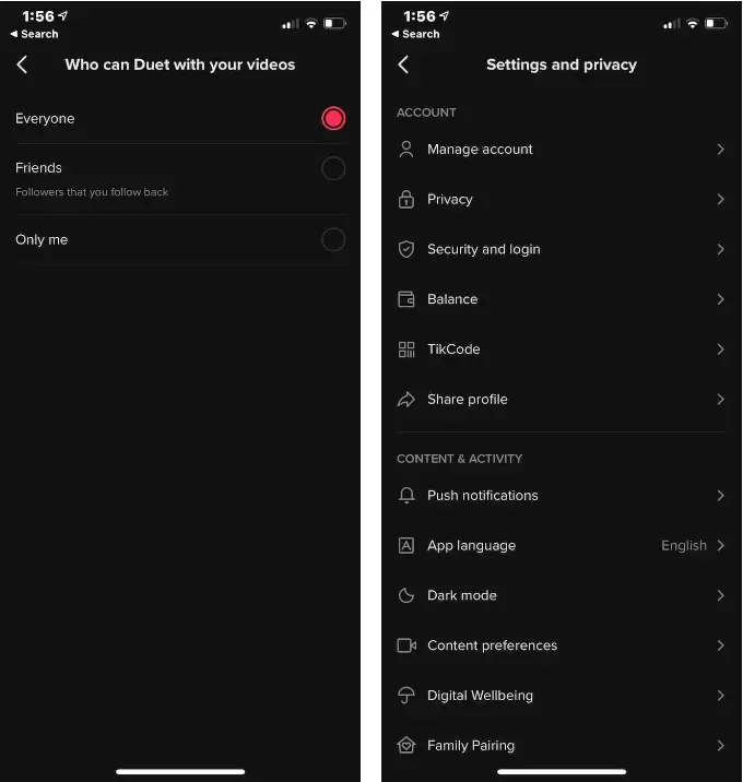 To adjust who can Duet with your videos, go to your privacy settings. Then select “Who can Duet with your videos.” From here, you can choose whether you want to allow everyone to Duet with your videos or restrict it to just your friends i.e. the followers you follow back. You can also set this to only you so no one else can Duet with any of your videos.
