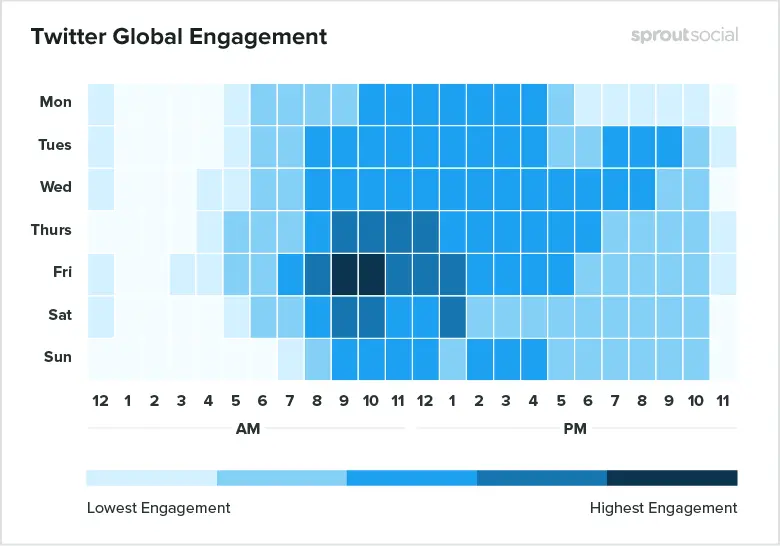 Per a study, Tweets get the most engagement on weekdays in the morning or early afternoons. The highest engagement rates are seen on Friday mornings between 9 am and 10 am.