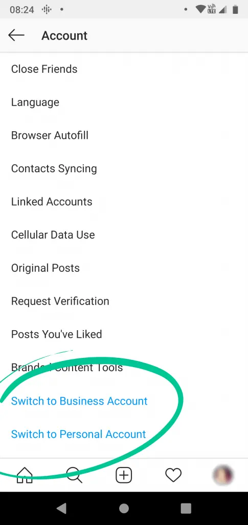 To change to a business account, open Instagram and go to your profile. Tap on the three horizontal lines in the top right corner (the “hamburger” menu) and then tap on Settings > Account and scroll down to the bottom of the page. There, you’ll see the option to switch to a business or creator account (or back to a personal account):