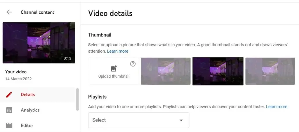 Next, scroll down to the “Thumbnail” section. From here, you’ll have the option to select scenes from the video as your thumbnail. You can even upload a custom thumbnail that stands out and would get people to click and watch your Shorts.