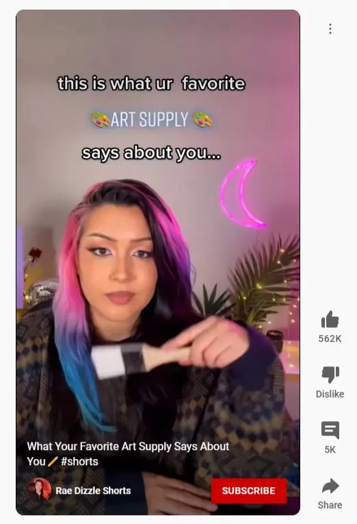 Many content creators rely on the “This is…” technique to start their Shorts. For example, if the video is about “What Your Favorite Art Supply Says about You,” they’ll add a voiceover at the beginning of the video immediately stating, “This is what your favorite art supply says about you.” They’ll also include a text layover saying the same thing.