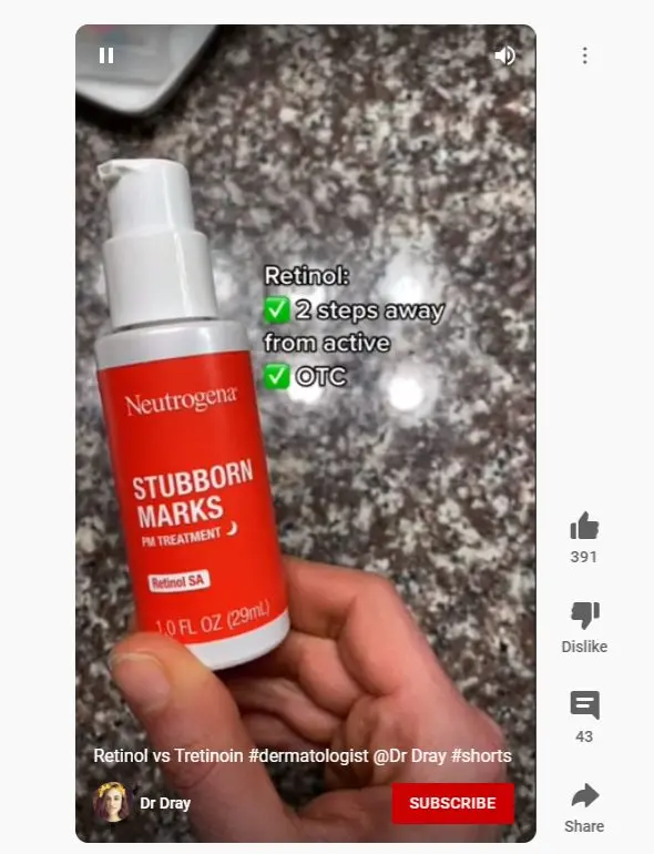 YouTube Shorts should be intentional and valuable so viewers would want to watch the entire thing. More importantly, it should get them curious enough to come back or click through to your channel to check out the rest of your content. For example, Dr. Dray uses YouTube Shorts to provide bite-sized information on skincare and skincare products.