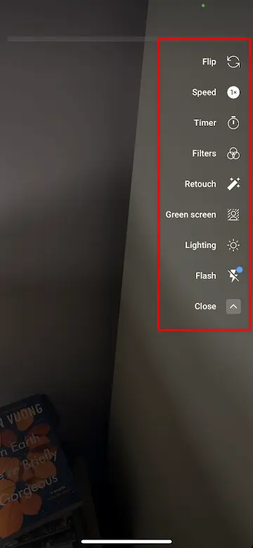 Step 5: From the toolbar on the right-hand panel, you can access plenty of features. This is where you can flip the camera view, adjust the recording speed, set a countdown timer, apply filters, turn on/off retouch, add a green screen, adjust the lighting, and turn on/off the flash.