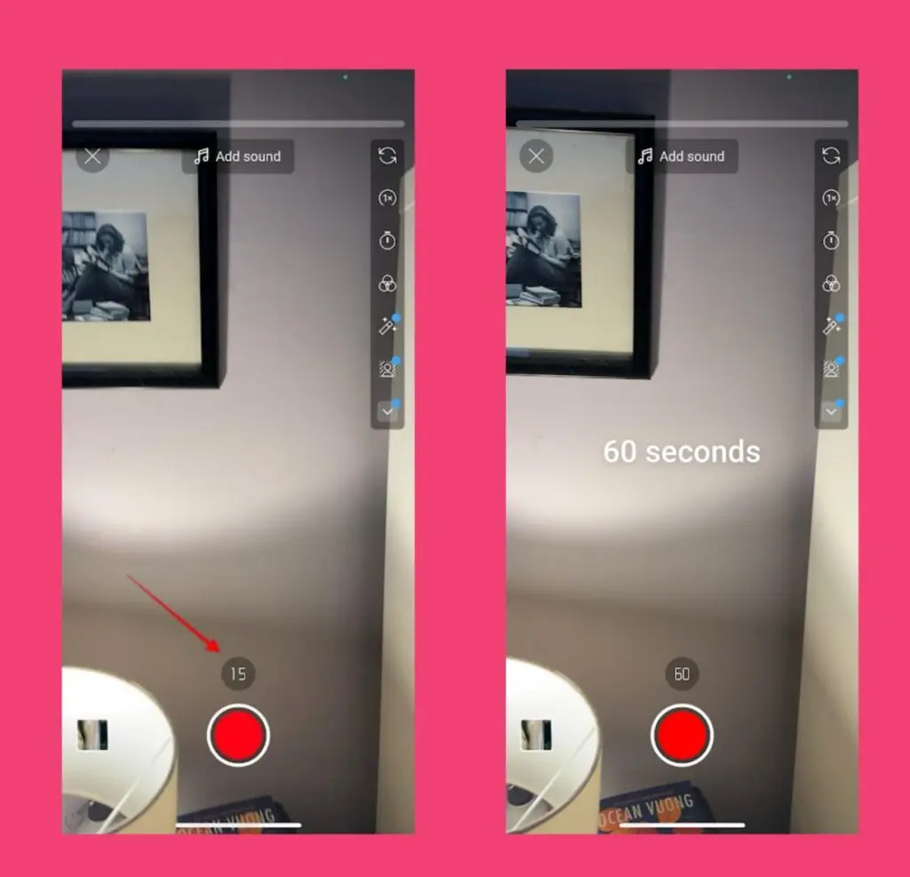 Step 3: By default, the camera is set to record up to 15 seconds of video. To record a longer video of up to 60 seconds, tap on the number “15” on the screen.