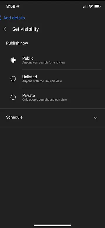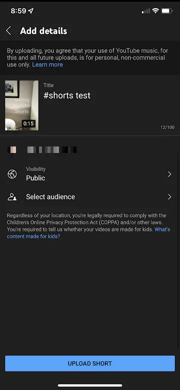 After everything’s ready, it’s time to publish your YouTube Shorts. Tap on “Next” at the top of your screen to finish your upload. The next screen will give you the option to add details, edit the visibility of your Shorts, and select an audience for it.