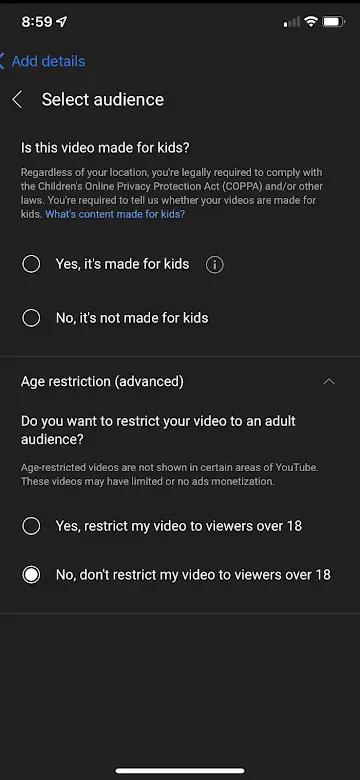 Step 4: Next, you can select the audience for your Shorts. This is where you specify whether or not the video is made for kids. Under the Advanced settings, you can also specify whether to restrict the video to viewers over the age of 18.