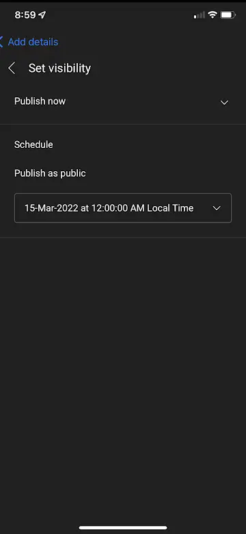 Step 3: If you’d like to publish your Shorts at a later date, tap on the “Schedule” button. Then choose a date and time that you want the Shorts to go out. Scheduling your YouTube Shorts allows you to maintain publishing consistency and avoid missing a publishing timeline.