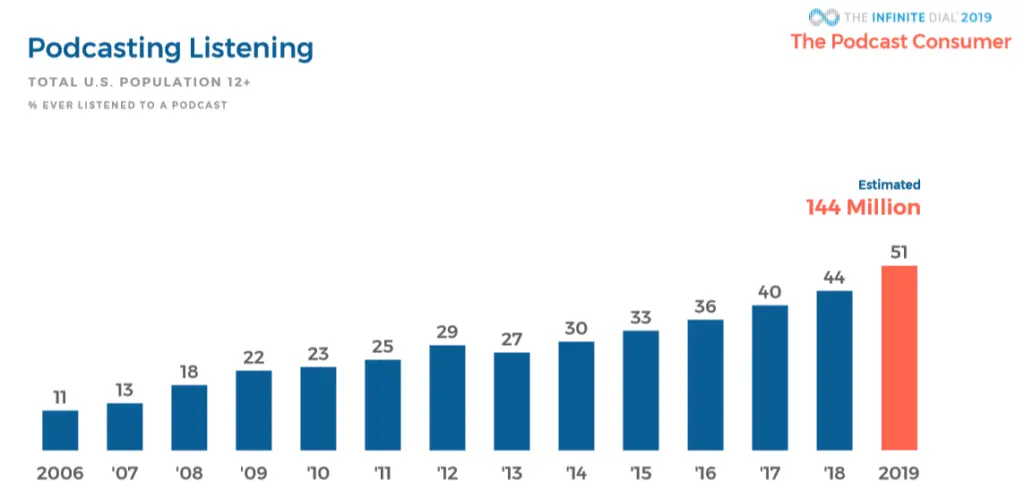 In fact, 51% of Americans have listened to a podcast at least once. In the same survey, 32% of respondents said that they had listened to a podcast in the past month.