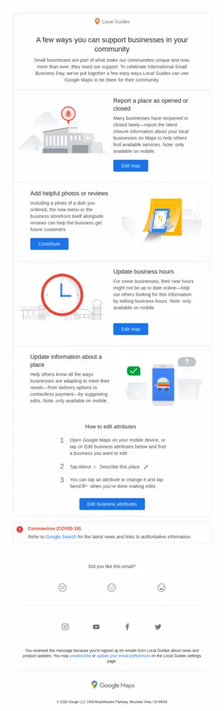 The most popular layouts for email are single and two-column layouts. A single-column layout shows the email content and elements in a stacked format and is largely preferred for mobile versions of emails since the content fits into a smaller screen much easier while still allowing mobile readers to use tapping and scrolling motions. Here’s an example of a single column layout: