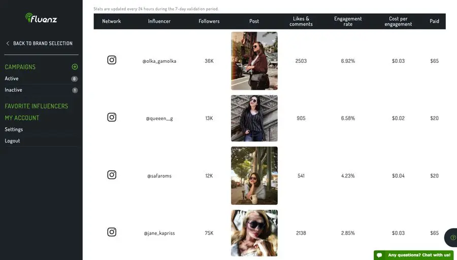 Ifluenz is a pay-as-you-go service. There’s no monthly fee and no subscription is necessary. You can sign up for free and create a campaign brief in a matter of minutes; what you spend is dictated by how much you pay the influencers you work with, plus a 15% commission that Ifluenz takes for each payment processed. Paying an influencer $100 to post a pic to Instagram? That’ll cost $115 in total.